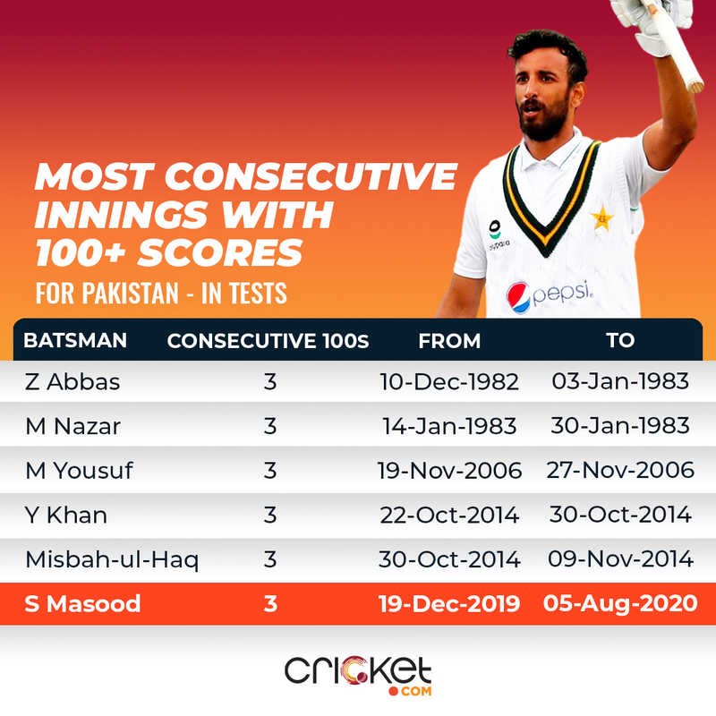 Two of probably the brightest prospects of Pakistan batting were exceptional in the first innings of the 1st Test. If Babar’s feat of consecutive 50s wasn’t enough, Masood’s achievement of three consecutive 100s was a level higher. Masood became the 6th Pakistan batsman to score 100s in three consecutive innings. His former skipper and the current head coach Misbah-ul-Haq was the last to achieve the feat. In fact, both Misbah and the batting coach Younis Khan feature in that elite list.