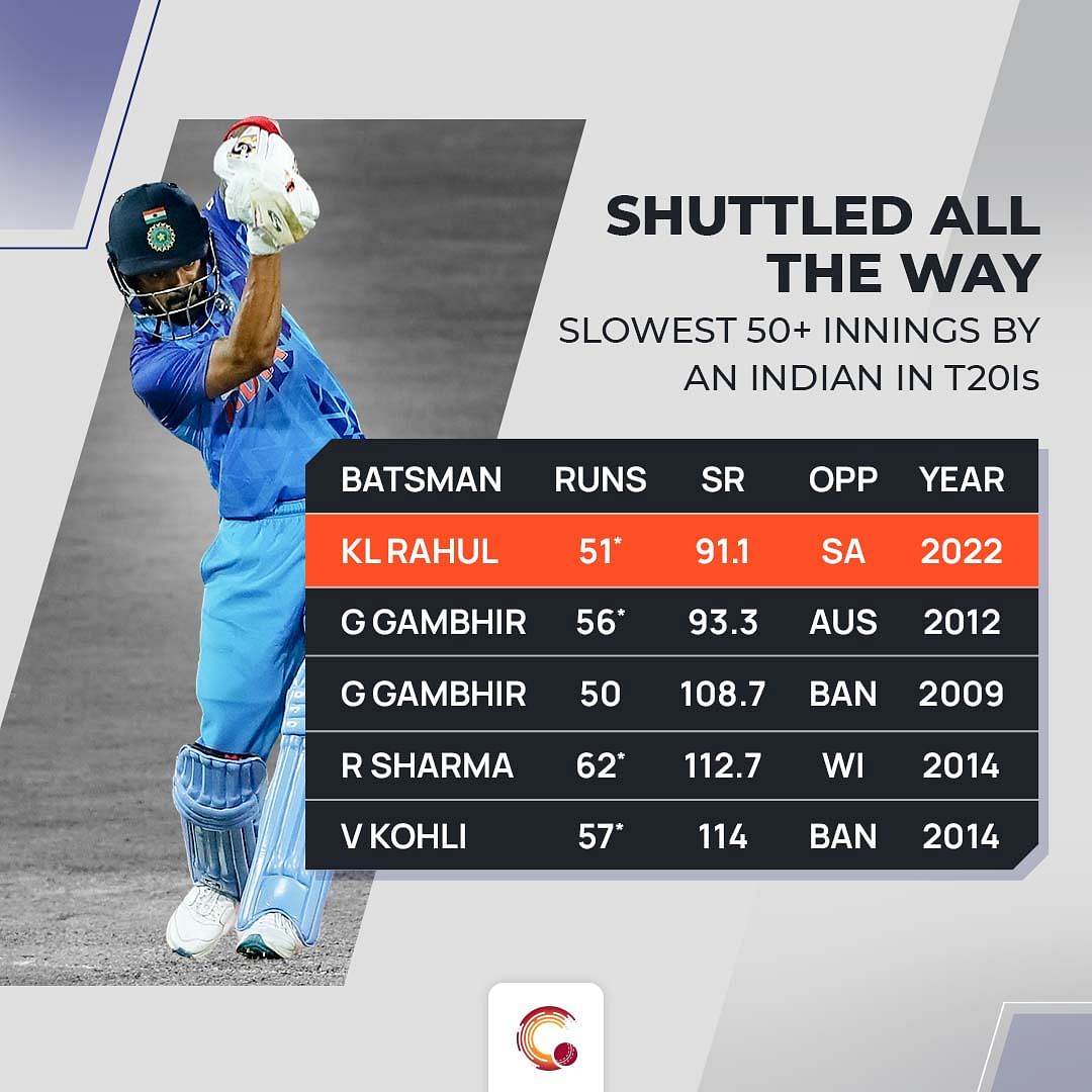 His start was so slow, despite scoring at a strike rate of 146.2 in his next 26 balls, Rahul ended his innings at a strike rate of 91.1. This is the slowest 50+ innings by an Indian batter in T20Is.