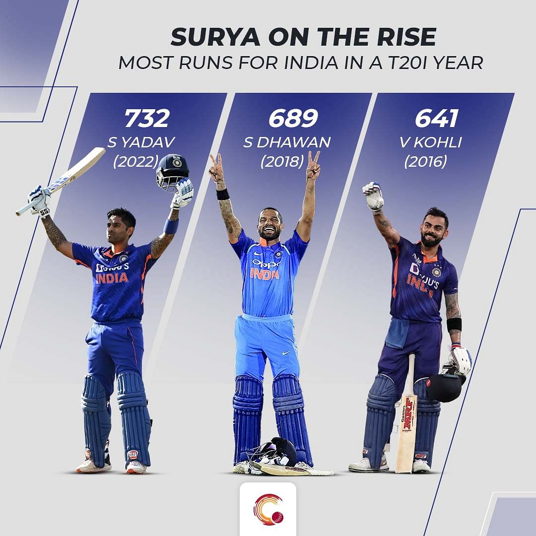 This year, Surya has scored 732 runs at an average of 40.7 and a whopping strike rate of 180.3. Among Indian batters, he is the first to score 700+ runs in a calendar year of T20Is. Overall, his tally of 732 is the fourth best for a batter.