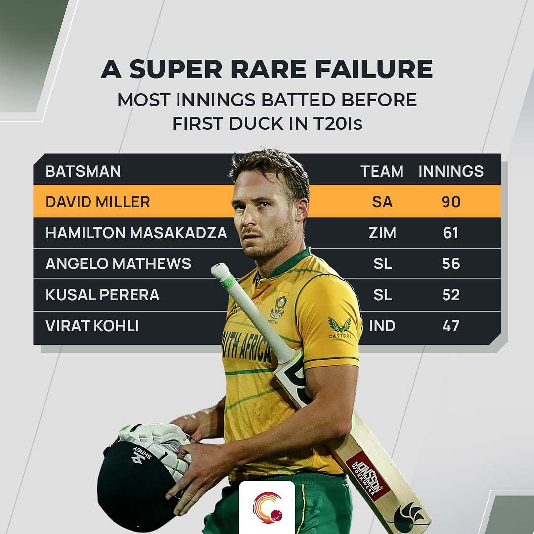 David Miller was also one among the three batsmen to suffer a golden duck. For the first time in his 91 innings T20I career, Miller registered a duck. Prior to this innings, among batters who had batted 40+ innings, Miller was the only batsman without a duck to his name.