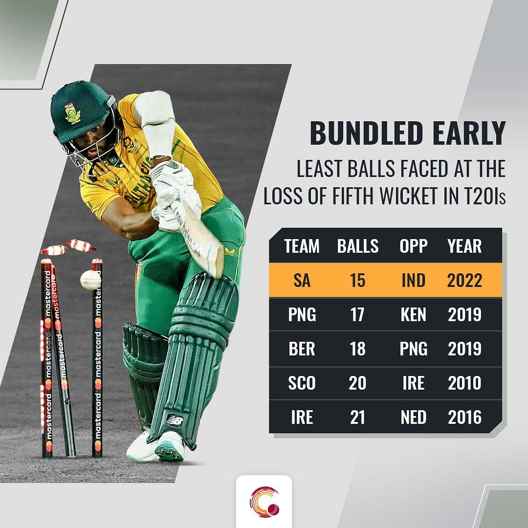 In just 15 balls, South Africa had lost five wickets. In T20Is, no team had lost their first five wickets in fewer balls (where ball data is available). In fact, no full-member nation had lost their first five wickets inside the first three overs.