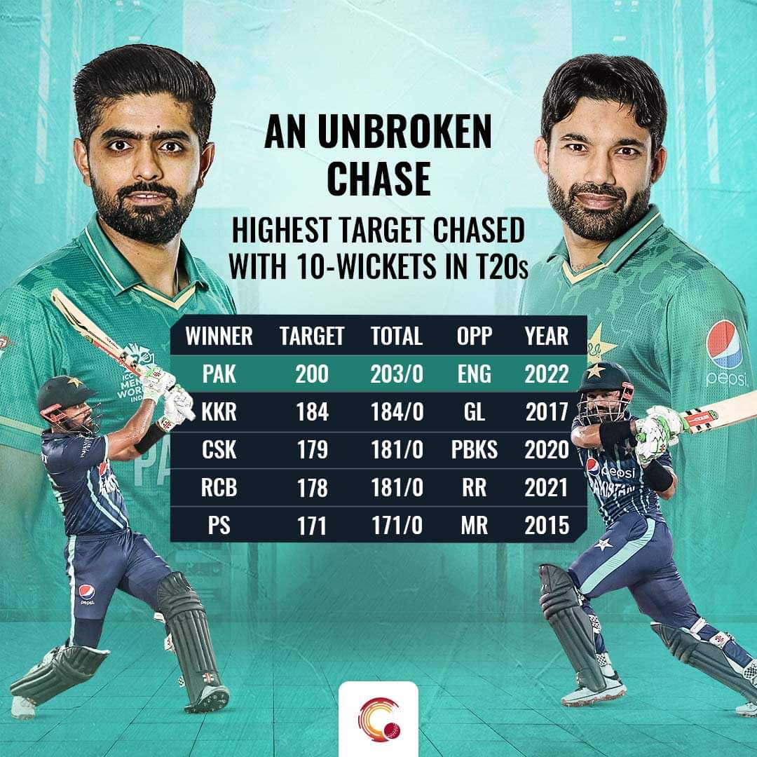 Chasing a mammoth total of 200, Babar and Rizwan took the attack to the bowlers from the word go. Hence, the pair were able to achieve the target of 200 with ease. In all T20s, the target of 200 is the highest target achieved with 10-wickets in hand. Previously, Kolkata Knight Riders in 2017, against the now-defunct Gujarat Lions, chased 184 with all their 10 wickets in hand.