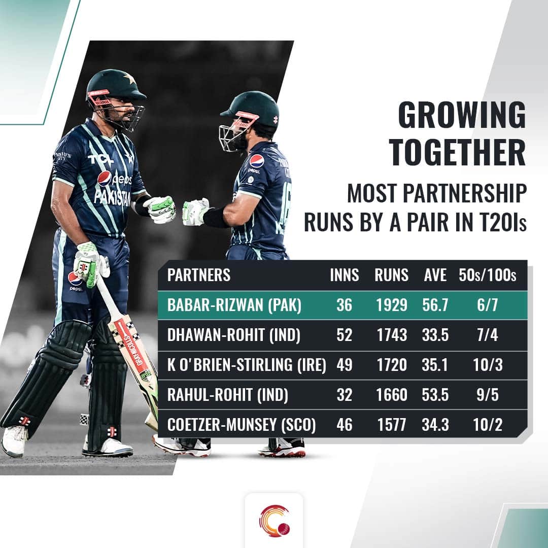 - After registering their 13th partnership of over 50 runs, the duo of Babar and Rizwan are one behind KL Rahul and Rohit Sharma in terms of most 50+ partnerships (14) in T20Is.