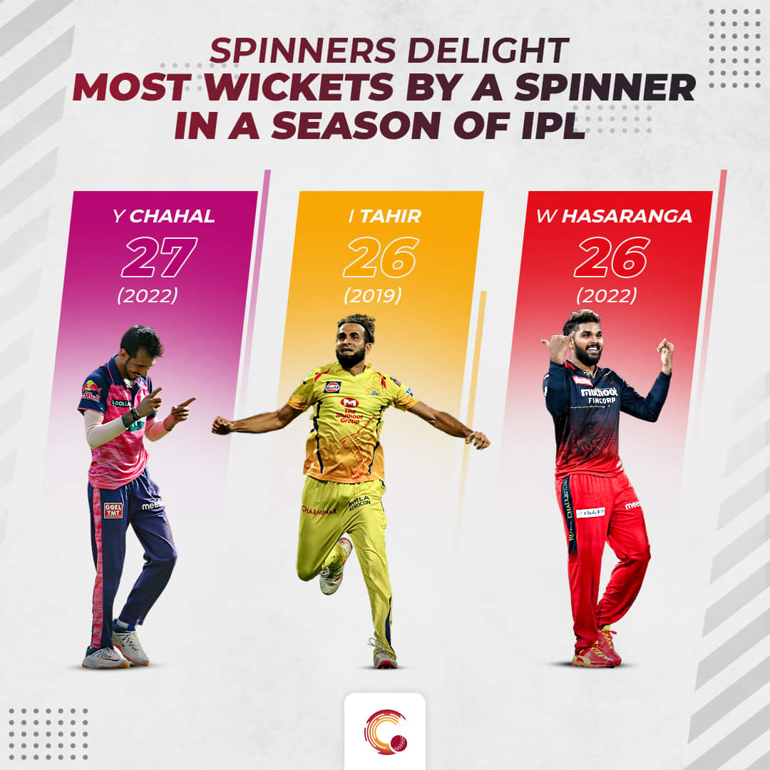 In a season of IPL, his 27 wickets are the most for a spinner. Imran Tahir in 2019 for Chennai Super Kings had 26 wickets, which was broken by Chahal in the finals. Among Indians, only Harshal Patel (32) in 2021 had more wickets than Chahal.