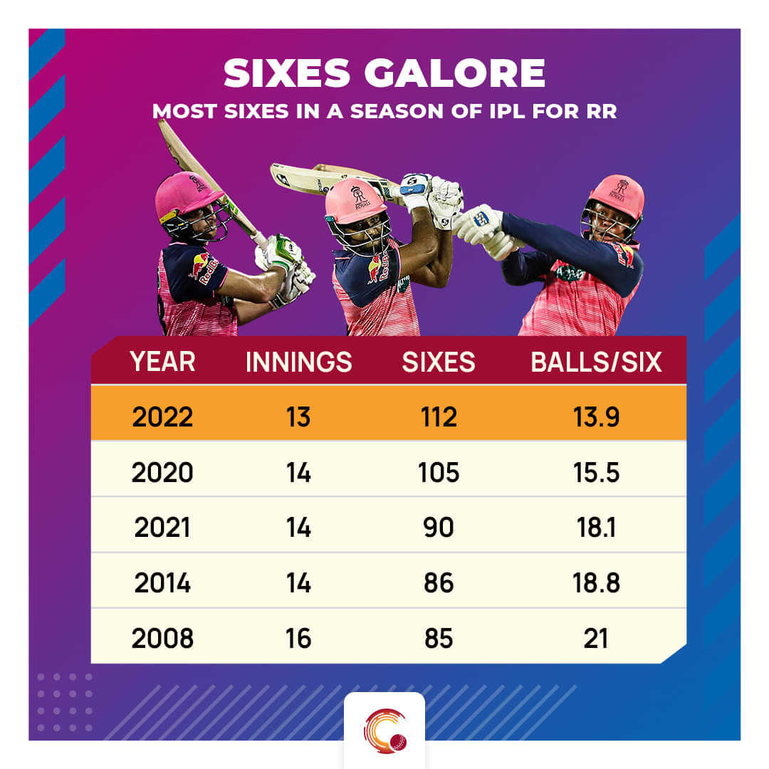 In fact, across the seasons of the IPL, the 112 sixes are the most number of sixes hit by Rajasthan. This was only their second season after 2020 (105) in which they had scored 100+ sixes. They have hit six every 13.9 balls, the best by a team in this edition.