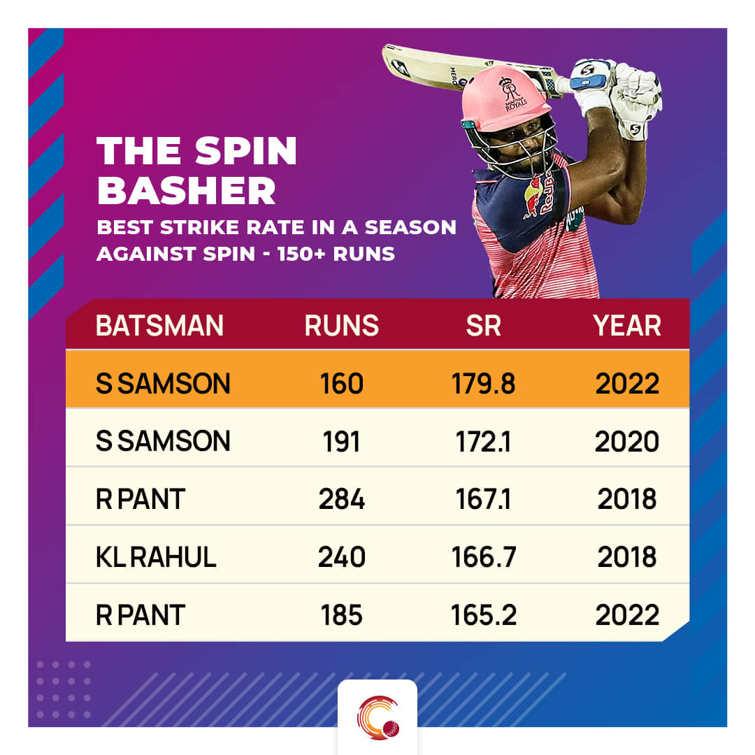 Samson is one of those Indian batters who have the ability to hit both sides of the ground with authority against spinners. In this season, he has averaged over 50 against spin at a strike rate of 179.8.
