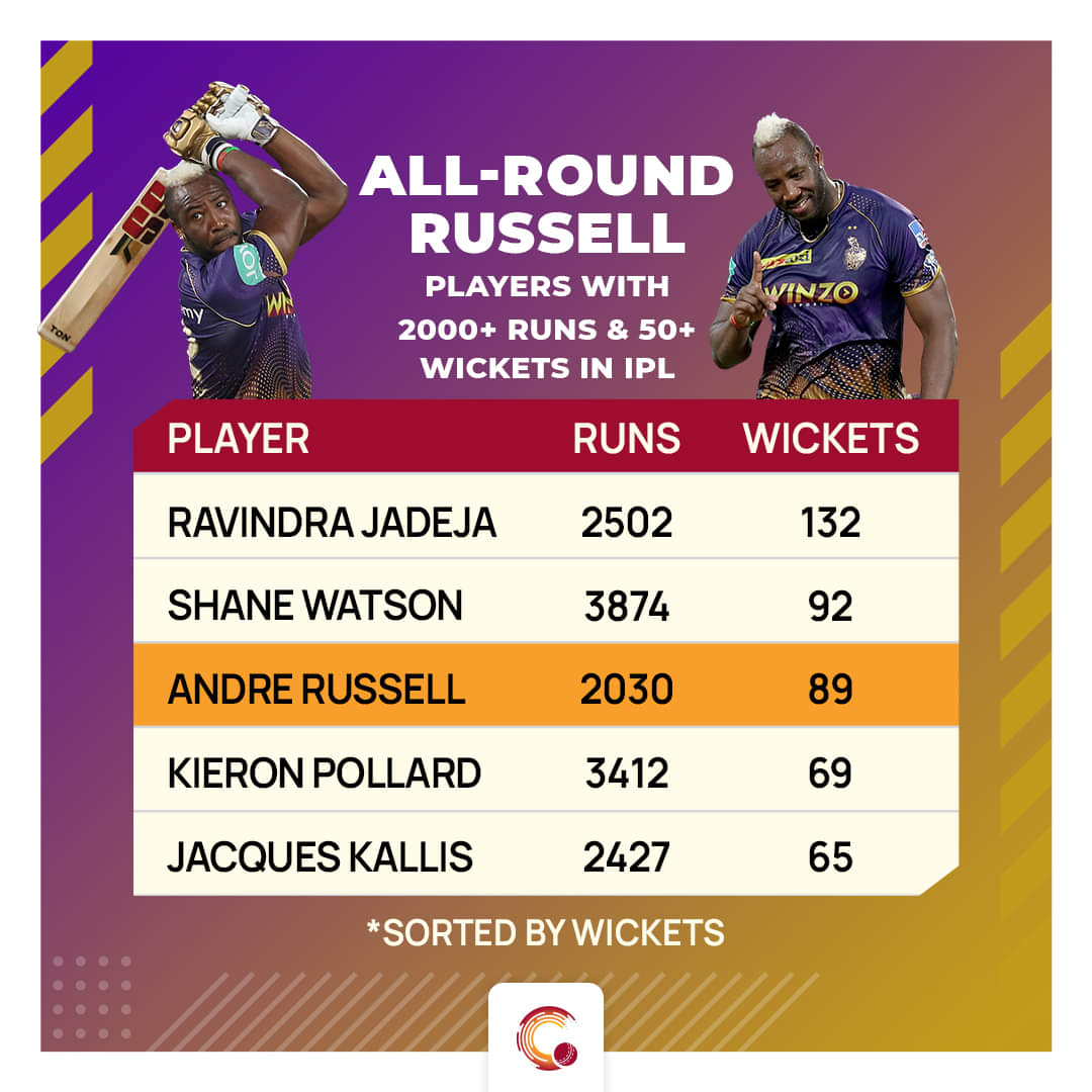 En route his unbeaten knock of 49 against Hyderabad, Russell joined an elite list of players in the IPL. By registering his 2000th run in his match against Hyderabad, Russell became the fifth player to achieve the double of 2000+ runs and 50+ wickets in IPL. To add more, he became the fifth player and the third from Kolkata to hit 300+ runs and bag 15+ wickets in a season of IPL. Jacques Kallis has achieved this feat across two seasons (2012 & 13), both for Kolkata.