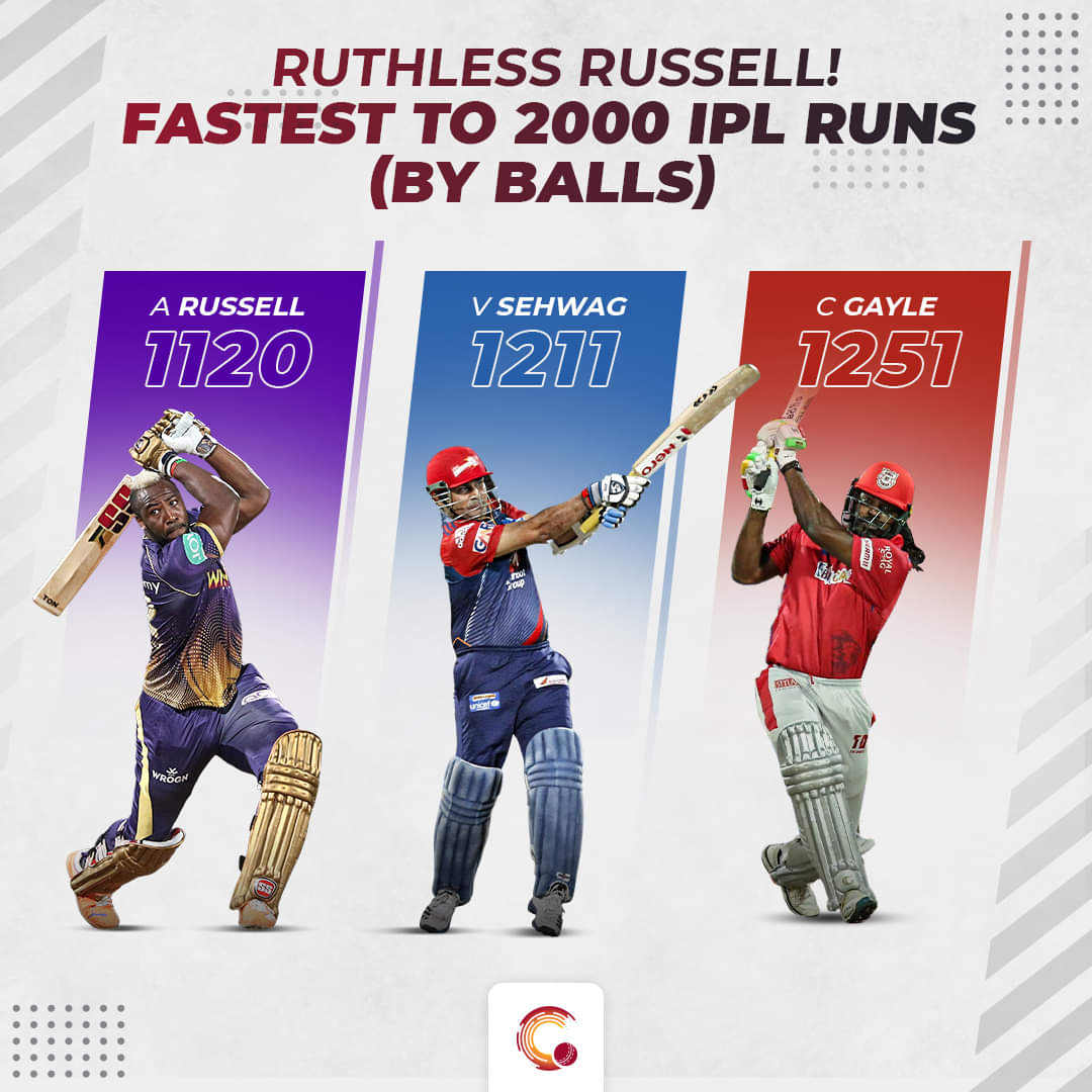 His 2000th- run in the IPL, came off just 1120 balls, which is the quickest for a batsman in the IPL. Virender Sehwag reached the milestone in 1211 balls, 91 balls slower than Russell.