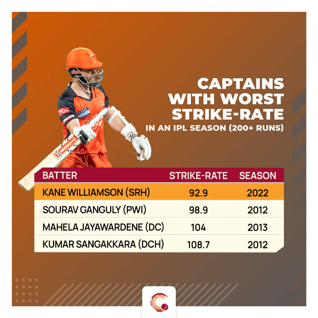 More to his agony, his overall strike rate of 92.9 in this season is the lowest for a captain who has scored 200+ runs in a season and the second lowest overall. Hanuma Vihari (86.7) in 2013 had a strike rate after scoring 200+ runs.