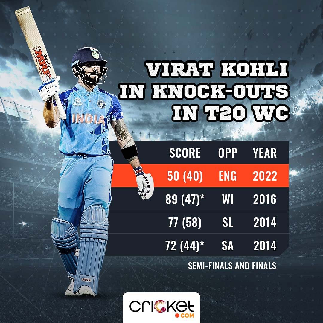 In the four knock-out matches (semi-final and final) of T20 WC, Kohli has four 50+ scores. No other batter has more than two. He has scored 289 runs at an average of 144 and a strike rate of 152.4.