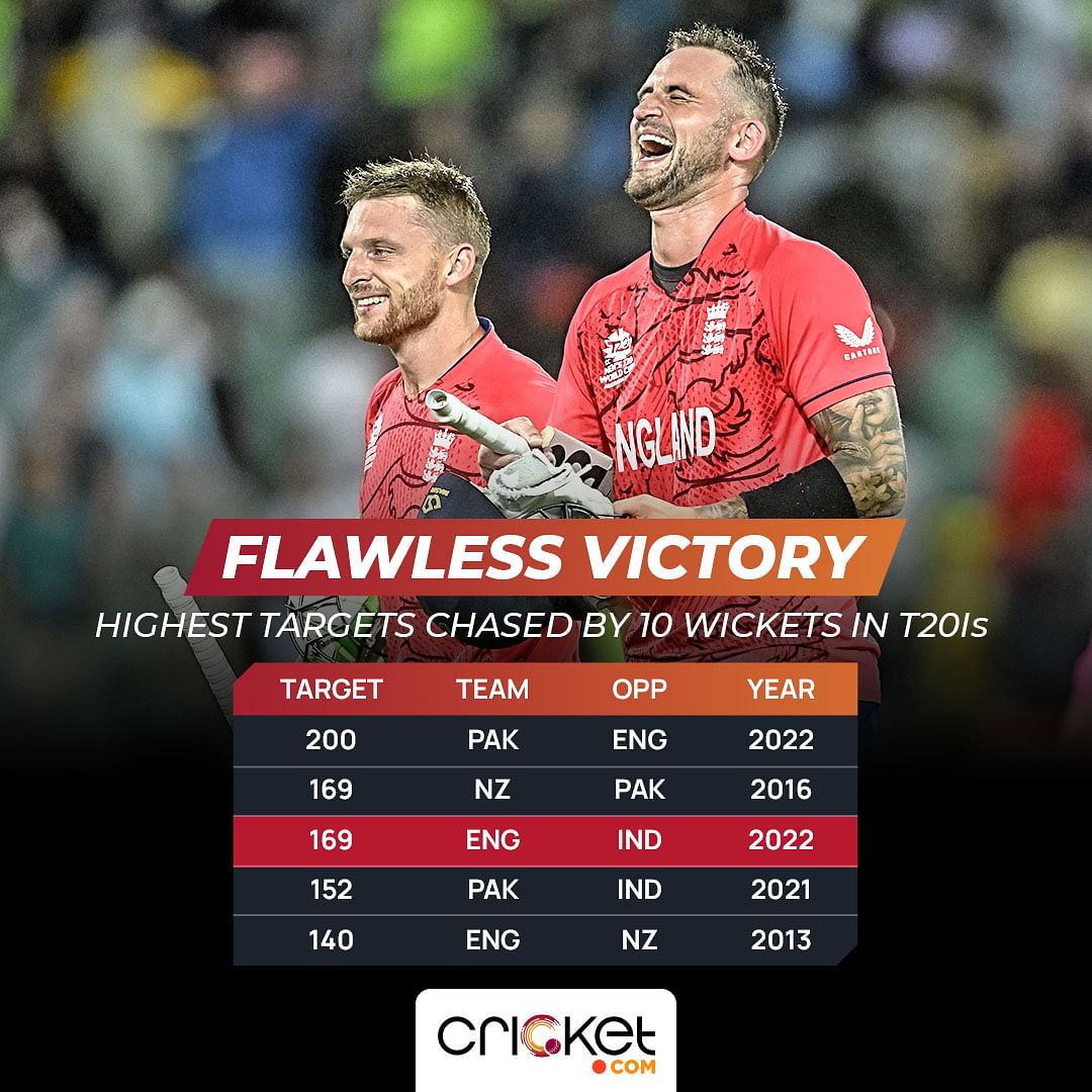 England chased a target of 169 without losing a wicket in this match. In T20Is, this is the joint second-highest target chased by a team with all wickets in hand.
