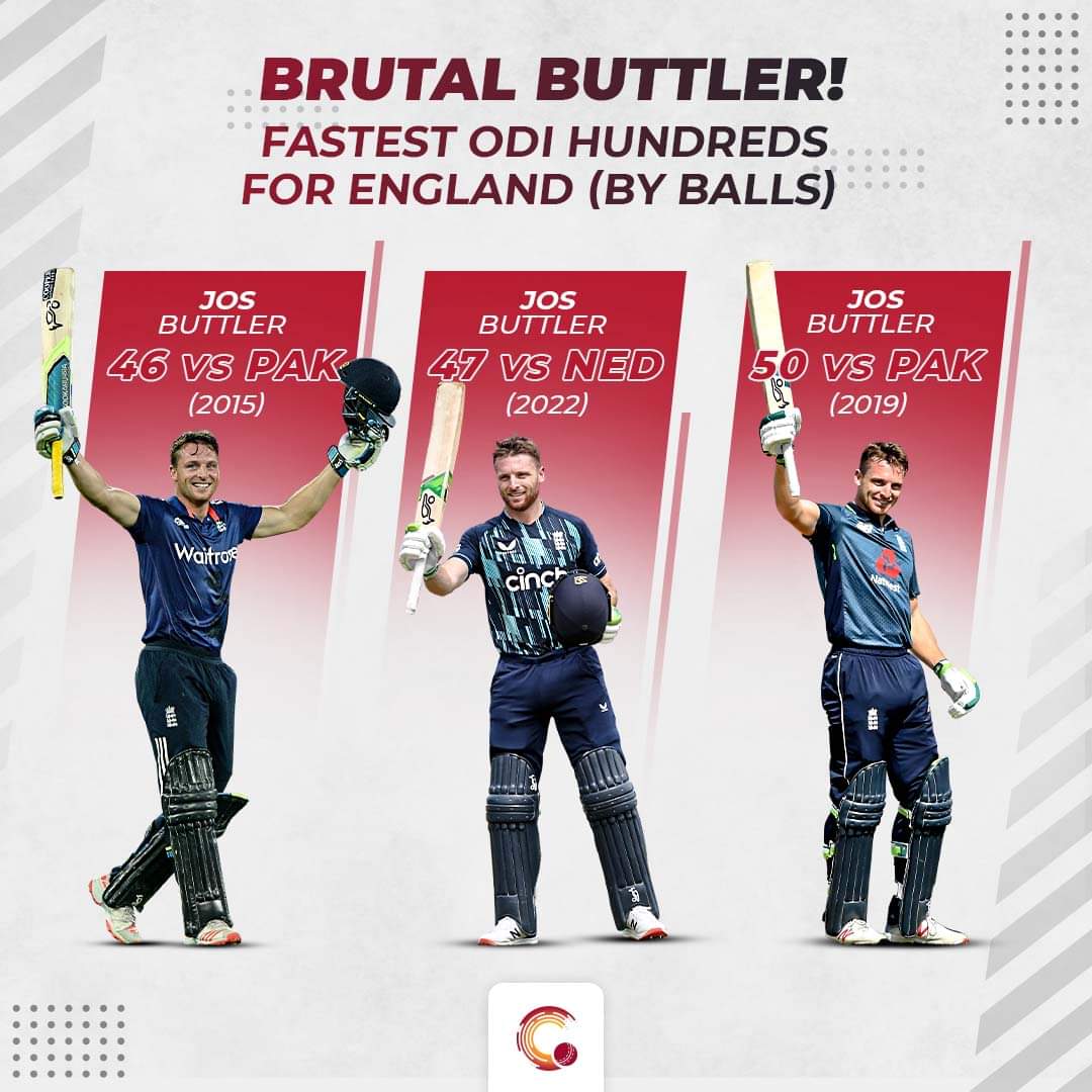 In his knock of an unbeaten 162 off 7 balls, Buttler set many records. Starting off, Buttler reached his century in just 47 balls, which is the second fastest ton by an England batter in ODIs. Co-incidentally, the top three in this list for England are all Buttler. In fact, he is the only batter in all ODIs to have registered a century in 50 or less balls thrice.
