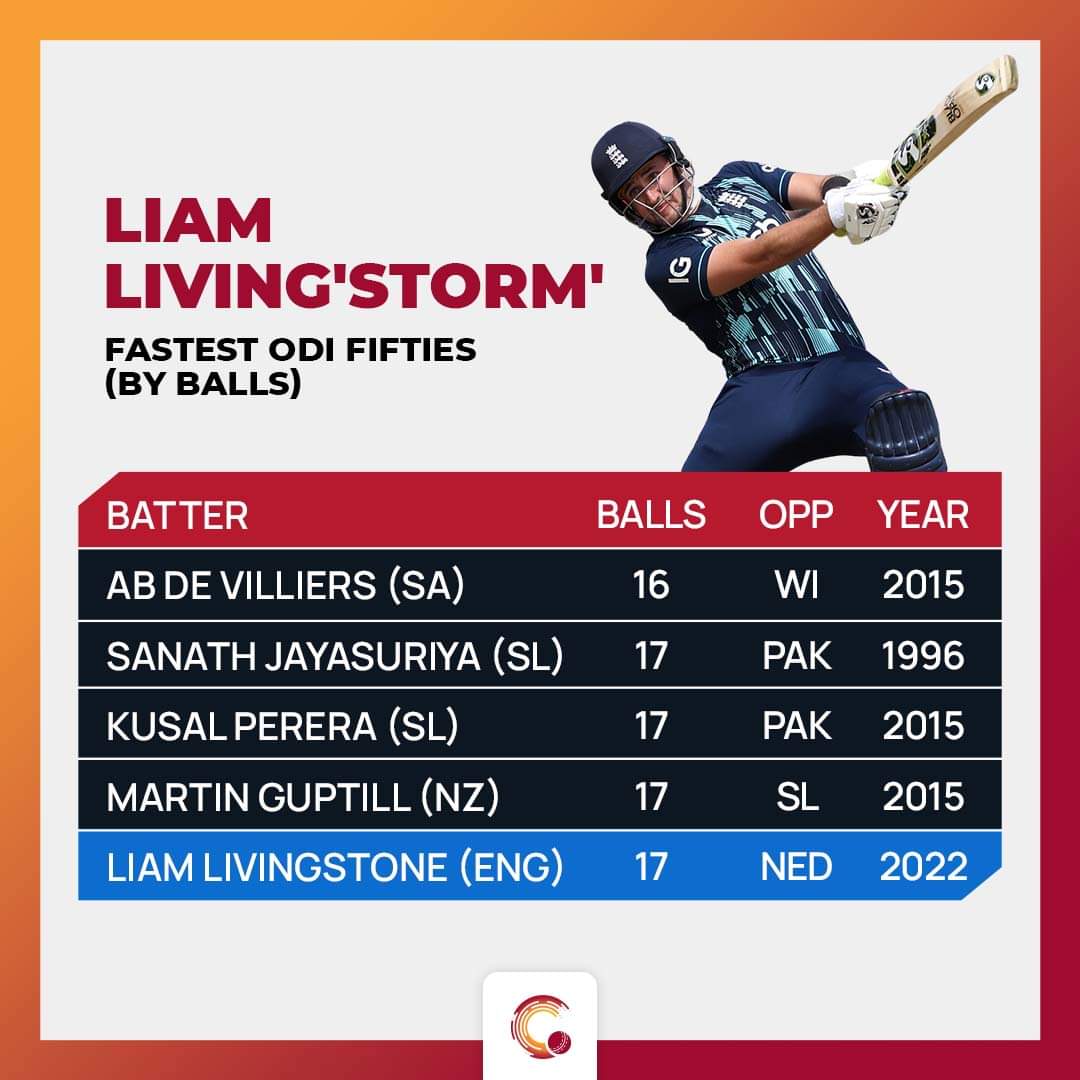 In the 46th over, he smashed 32 runs against Philippe Boissevain. After facing 13 balls, Livingstone was batting on 46 and had the chance of breaking AB de Villiers record for the fastest half-century in ODIs. However, he fell short of it and registered a 17-ball half-century, the joint-second best in ODIs.
