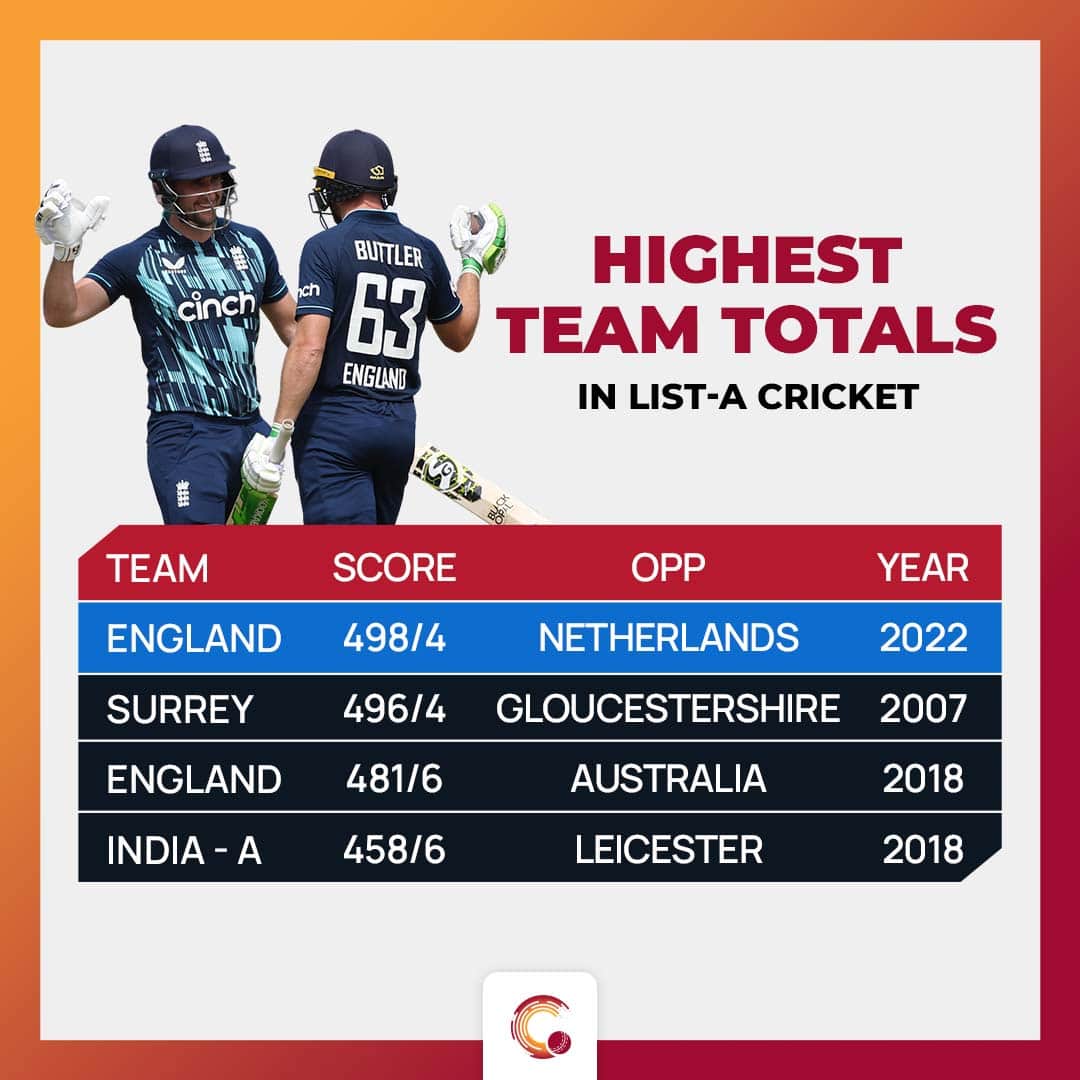In the final over of England’s innings, in the third ball, Buttler launched a six over mid-wicket to record the highest total in ODIs. Livingstone in the last two balls, extended the total to 498/4 with a four and a six of the last two balls. By the end of the innings, England not only had the highest ODI total, but also, the highest List-A total. Interestingly, in ODIs, the top three highest totals belong to England.
