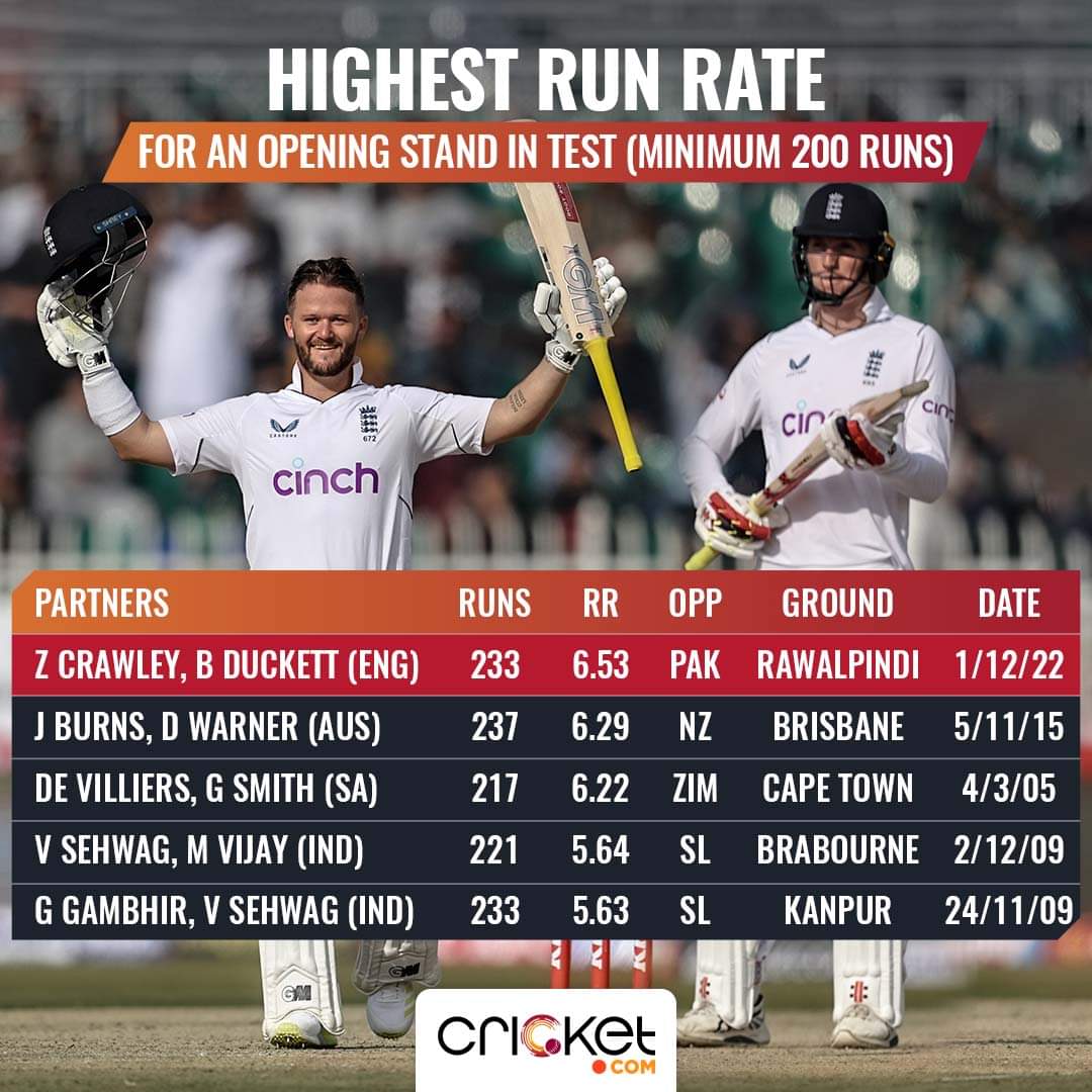 Before Zahid Mahmood trapped Duckett leg before, England were 233 in just 214 balls at 6.53, which is the highest run rate for an opening stand in Test history.
