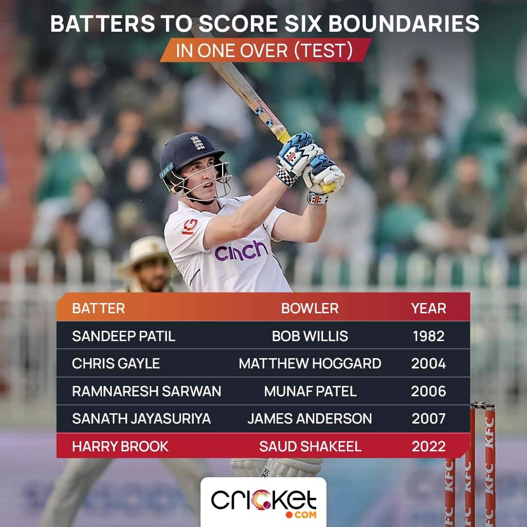 He then slammed six consecutive boundaries off left-arm spinner Saud Shakeel's 68th over, which is the only fifth time it has ever happened in Test history. The feat put Brook in company of Chris Gayle, Sandeep Patil, Sanath Jayasuriya and Ramnaresh Sarwan.