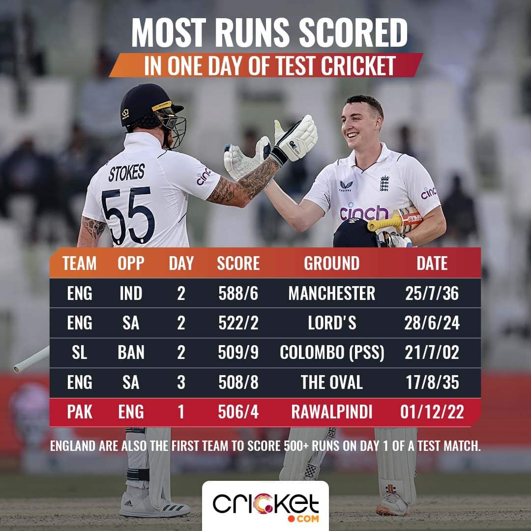 Ben Stokes' England set the bar high for Test batting when they walked out on Day 1 of the first Test against Pakistan on Thursday. On an expected batting haven, the visitors piled on runs at an unprecedented rate putting Pakistan bowlers to the sword.