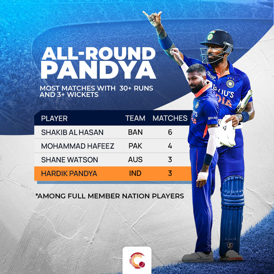 In T20Is, this was the third match in which he had scored 30+ runs and picked up three wickets. Among Indians, he now has achieved this feat the most times, surpassing Yuvraj Singh, who had achieved this twice. Overall, among full member nation players, Shakib Al Hasan (7) and Mohammad Hafeez (4) have achieved this feat more times.