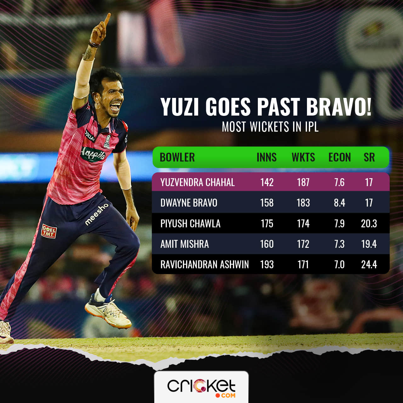 With the wicket of Nitish Rana, Chahal went past Dwayne Bravo's tally of 183 wickets to become the leading wicket-taker in the IPL. He now has 187 wickets.