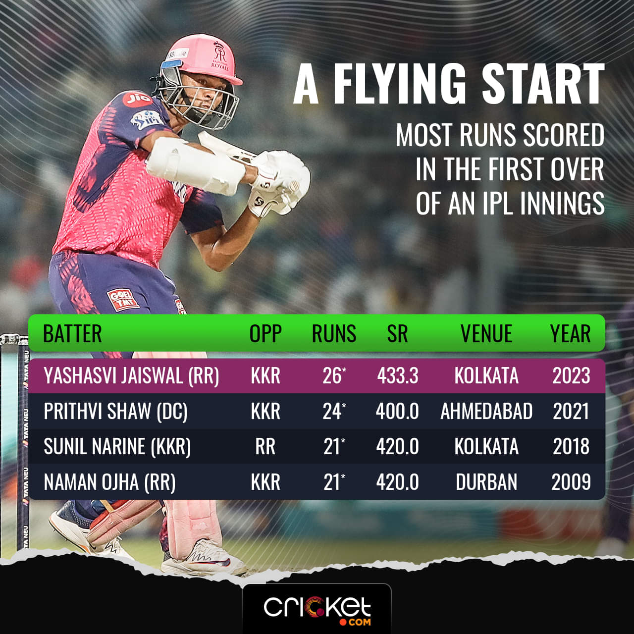 In this innings, Jaiswal became the second batter in the IPL to start the innings with two sixes. Virat Kohli, against Rajasthan in 2019, began with two sixes.