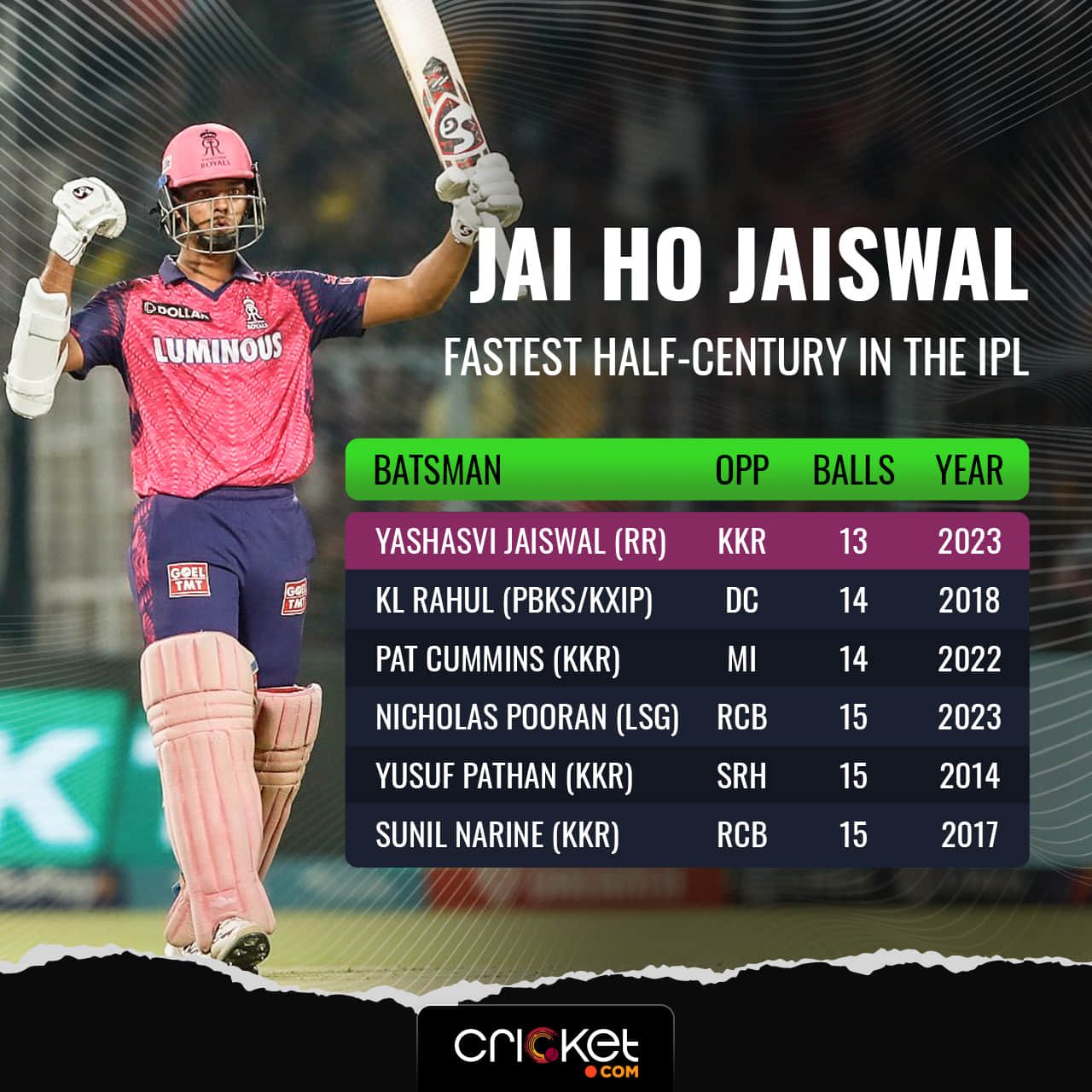 In his first ten balls, Jaiswal had scored 41 runs, a strike rate of 410. In the first ten balls of an IPL innings, it is the joint-highest alongside AB de Villiers in 2019.