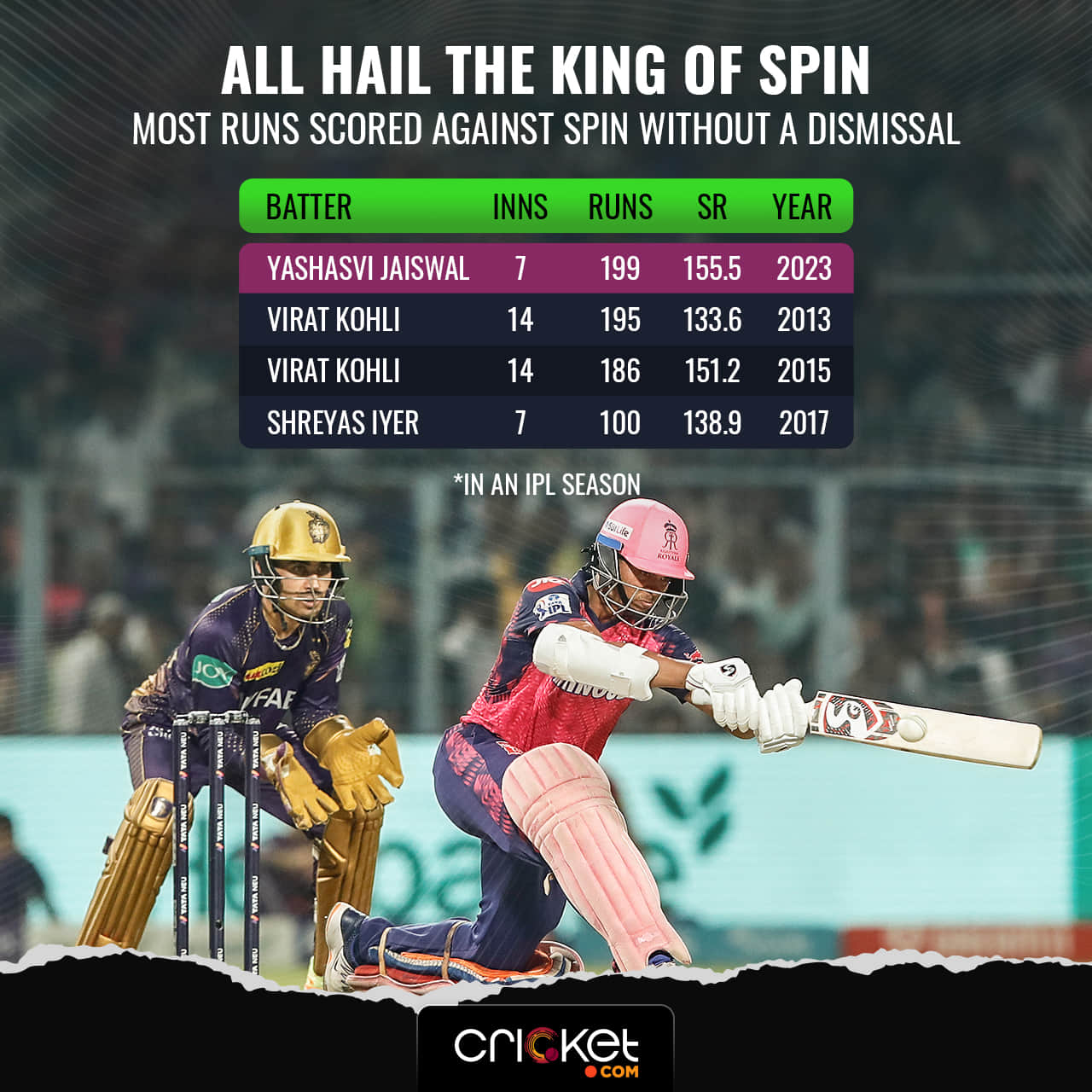In this IPL, Jaiswal has faced 128 balls against spinners scoring 199 runs (155.5 SR) without a dismissal. In a season of IPL, these are the most runs scored by a batter without being dismissed. Kohli, in 2013, had scored 195 runs at a strike rate of 133.6.