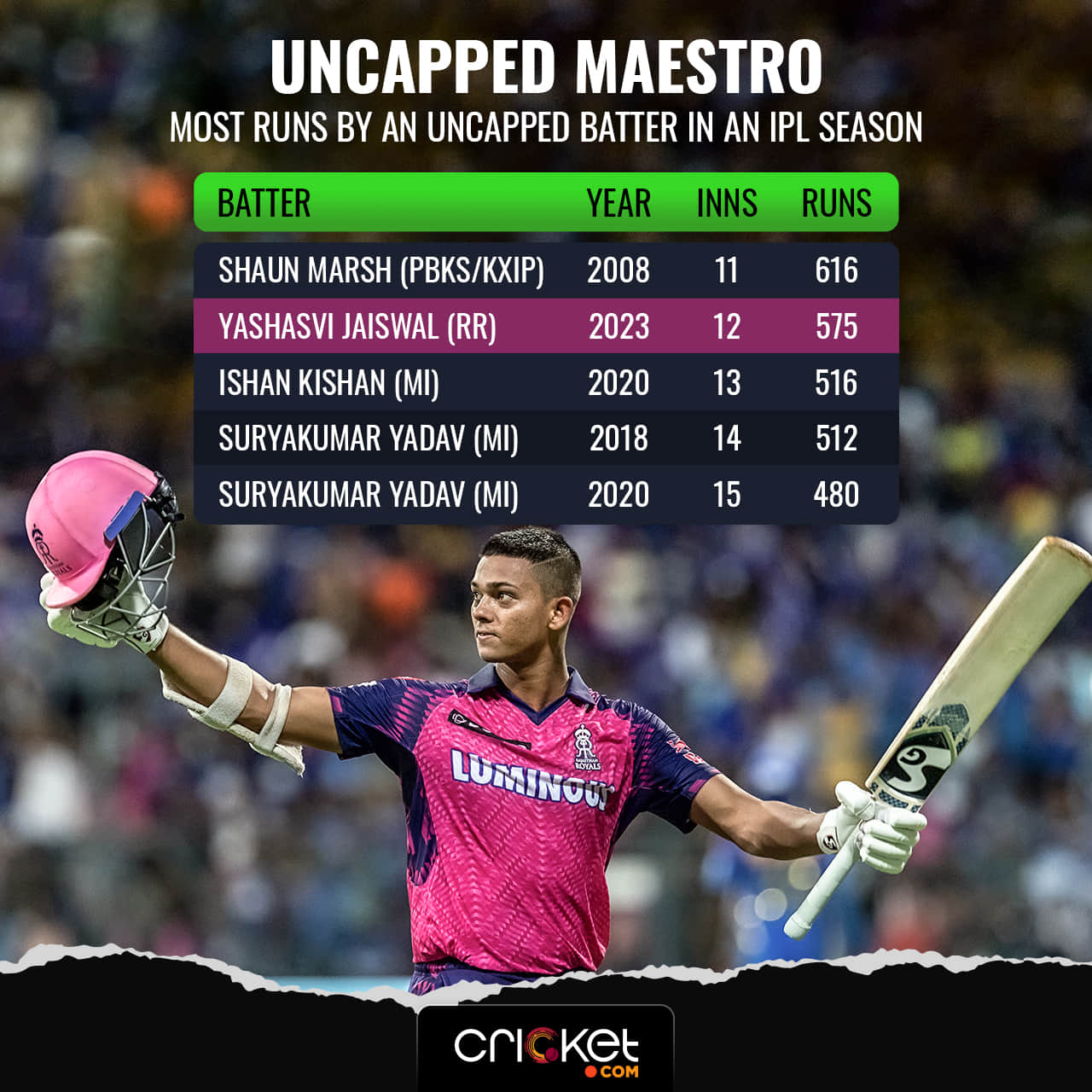 In a season of IPL, only one uncapped player has scored more runs than Jaiswal. Shaun Marsh, in the inaugural season, scored 616 runs.
