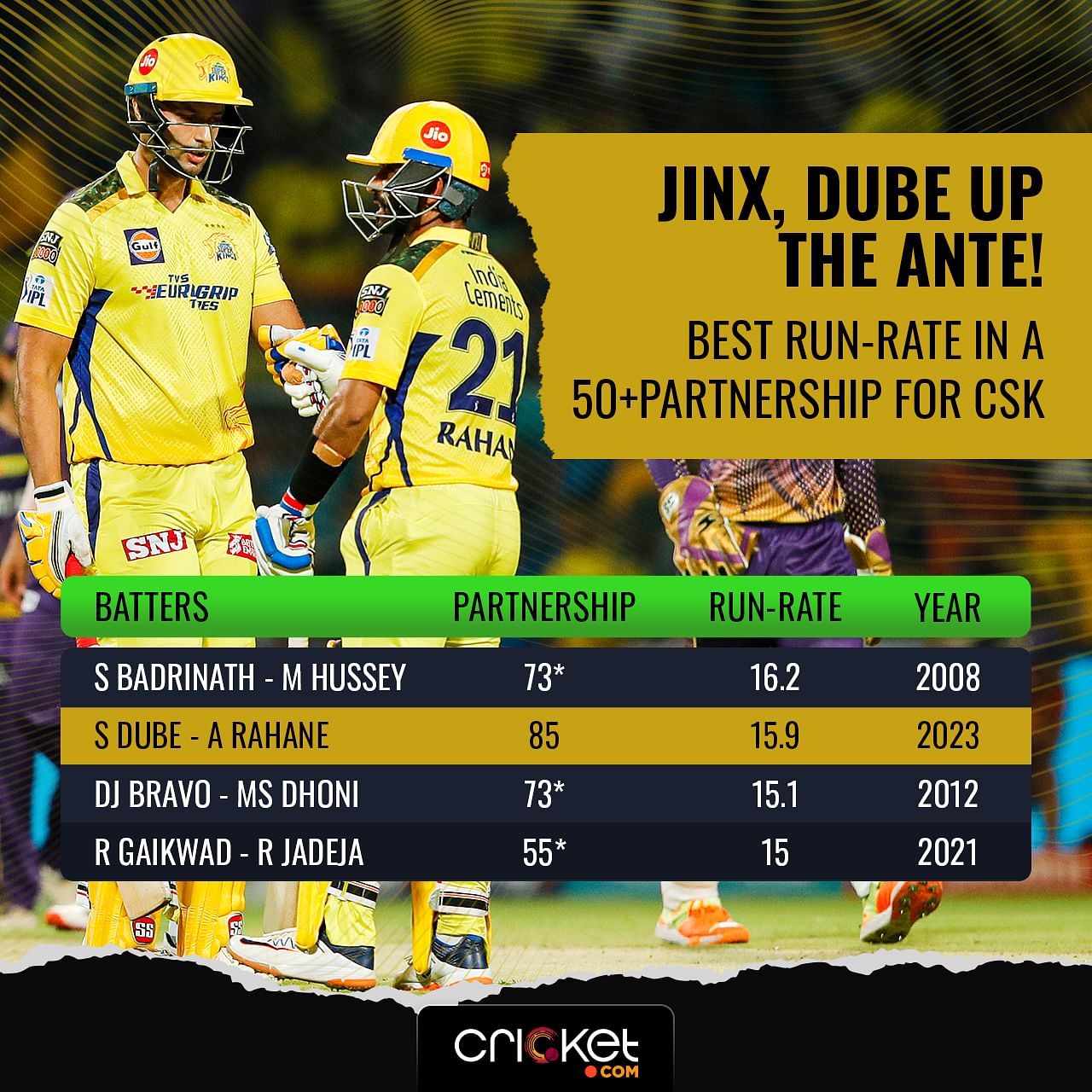 Their partnership had a run rate of 15.9. In the IPL, only the pair Mike Hussey and Subramanian Badrinath (73*) in 2008 against Punjab Kings (Kings XI Punjab then) had a better run rate in a 50+ partnership for CSK.