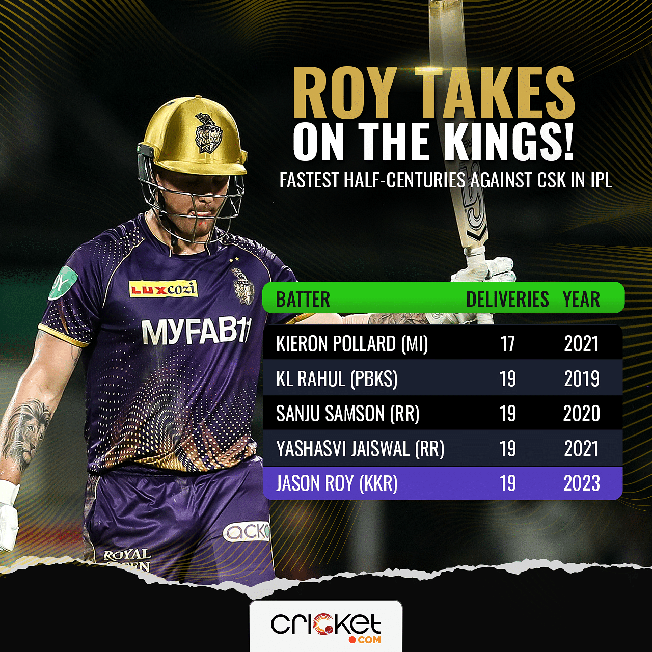 - Among the five batters who scored 50+ in this match, Jason Roy's 19-ball half-century was the quickest. In the IPL, his feat is the joint-second fastest against CSK and the quickest for a KKR batter against CSK.