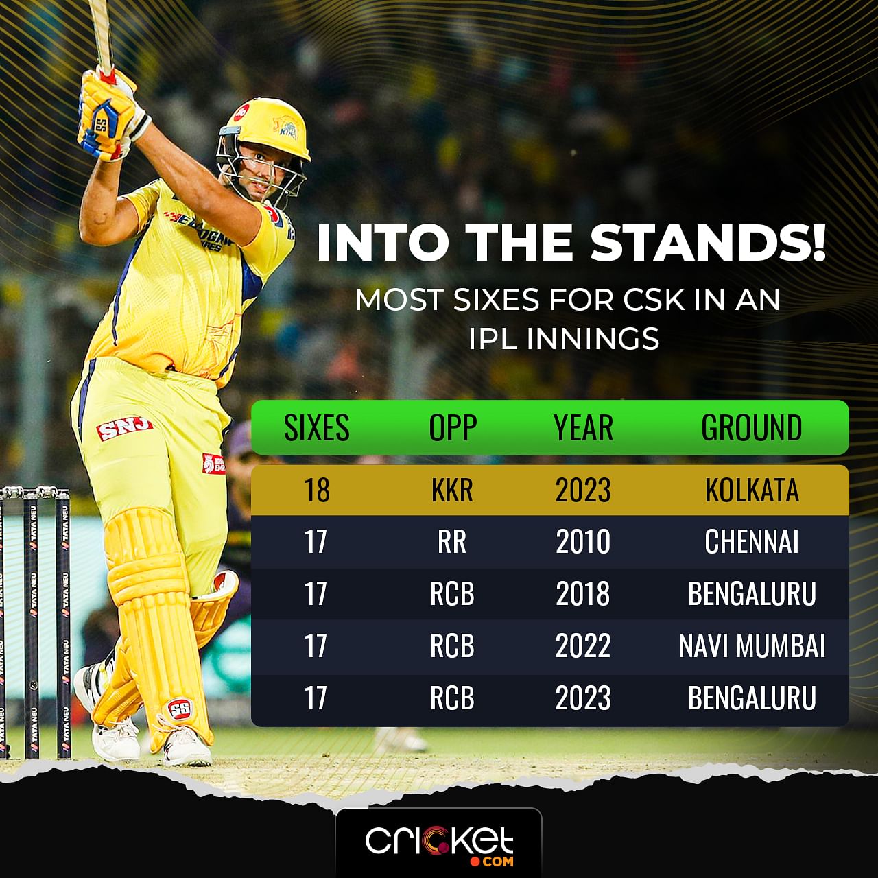 In their innings, CSK batter smashed 18 sixes. Rahane and Dube hit five each, three from Ruturaj Gaikwad and Devon Conway and two by Ravindra Jadeja.