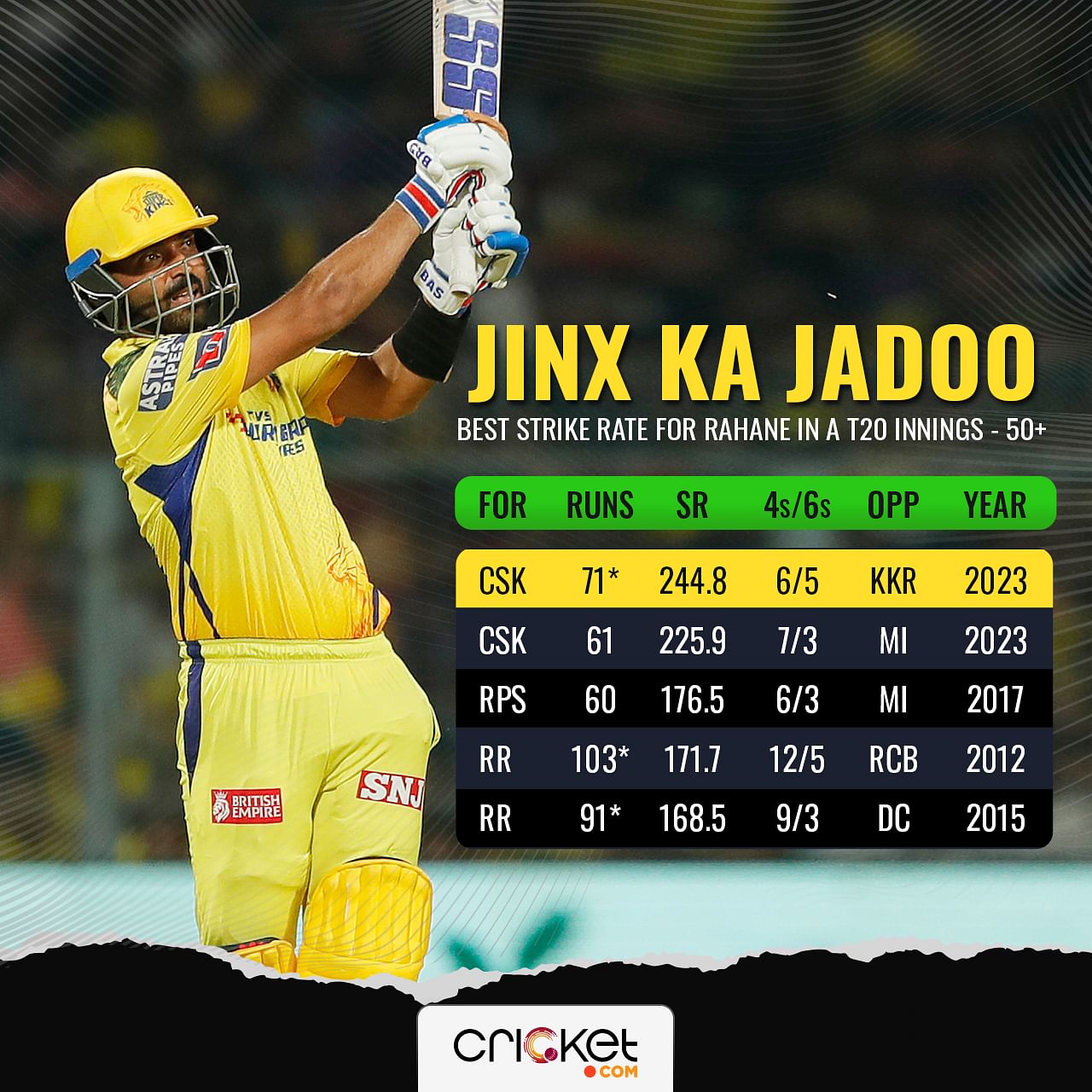 In his match against KKR, Rahane smashed an unbeaten knock of 71 at a strike rate of 244.8. This is his best strike rate in a 50+ run innings in all T20s. The Mumbaikar hit five sixes in his knock, the joint-most for him in an innings.