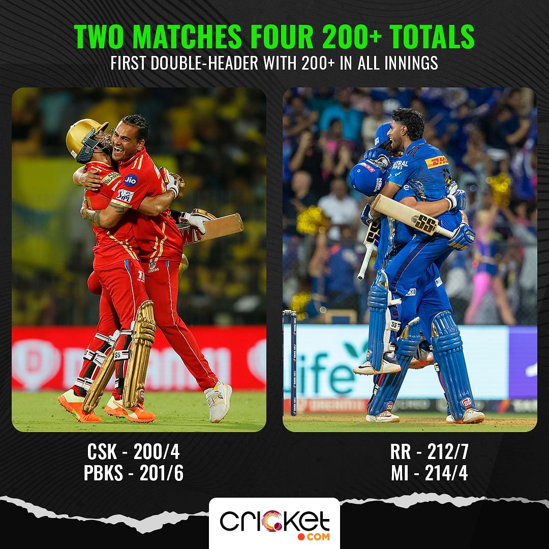 In the IPL, this was the first-ever double-header day that saw a 200+ total in all four innings. Punjab chased a target of 201 against Chennai, and Mumbai hunted 213 against Rajasthan.