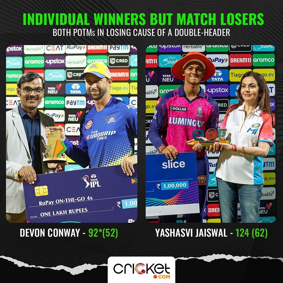 In fact, the Man of the Match awards have been handed over to the players from the losing side in the last three matches. Mitchell Marsh against Sunrisers Hyderabad in Match 40. Devon Conway and Yashasvi Jaiswal in Match 41 & 42.