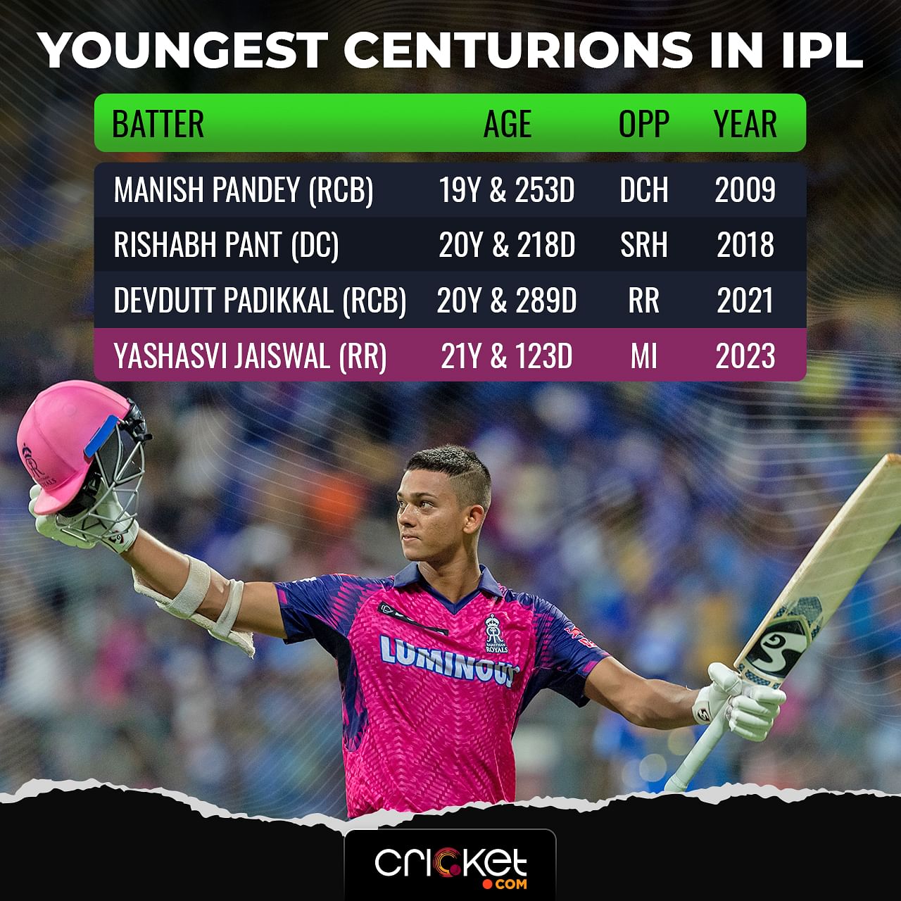 - In the IPL, Jaiswal became the youngest for Rajasthan and the fourth youngest overall to register a century.