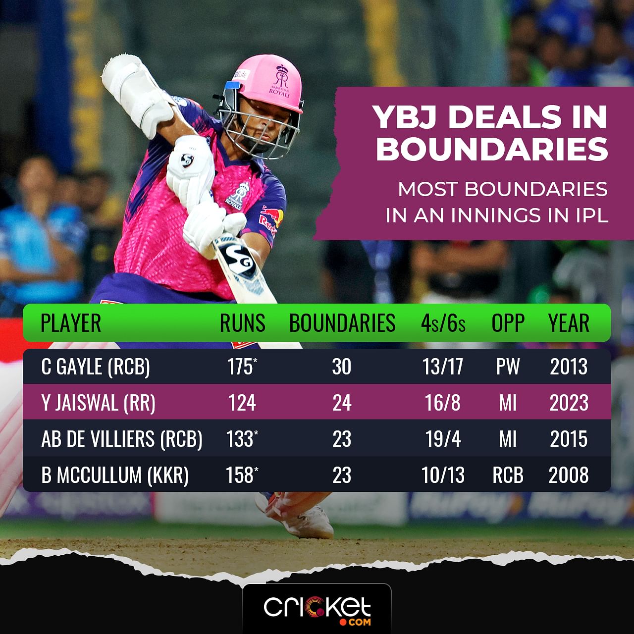 - In his innings, he smashed 24 boundaries (4s - 16, & 6s - 8), the most for a Rajasthan batter in an innings and the second-most in the IPL.