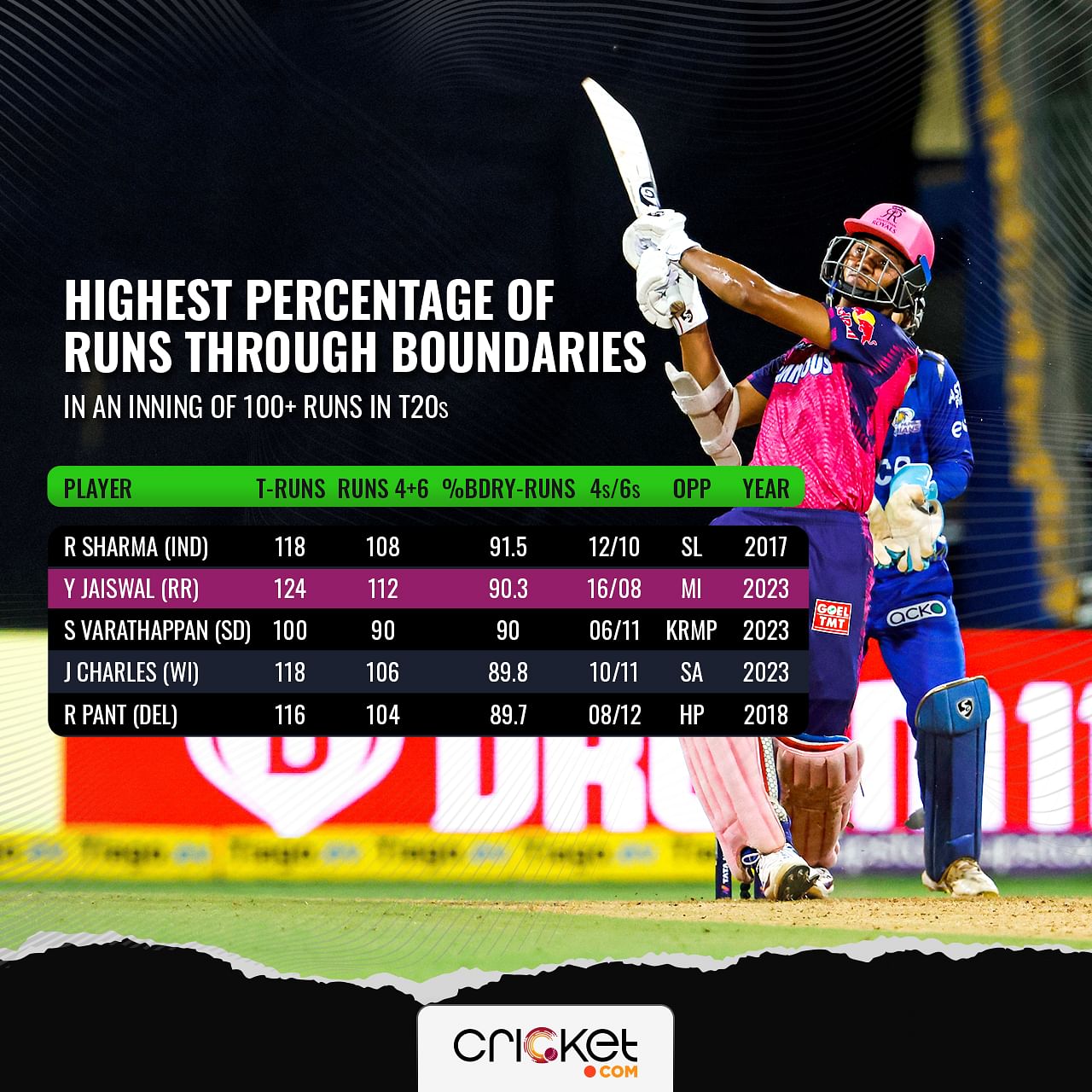 - The Rajasthan opener scored 112 out of 124 via boundaries, 90.3% of his runs. His ratio is the second-highest in an innings of 100+ runs in all T20s.