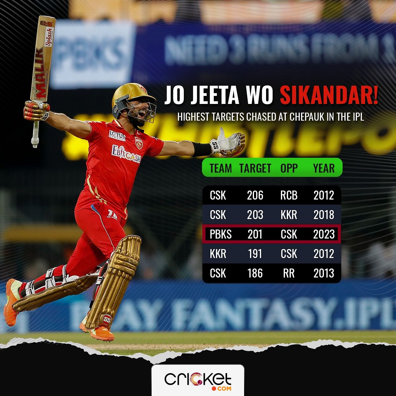 - At Chepauk, this is only the third successful (third highest) chase of 200+ in the IPL. Punjab are the first team other than Chennai to achieve this feat.