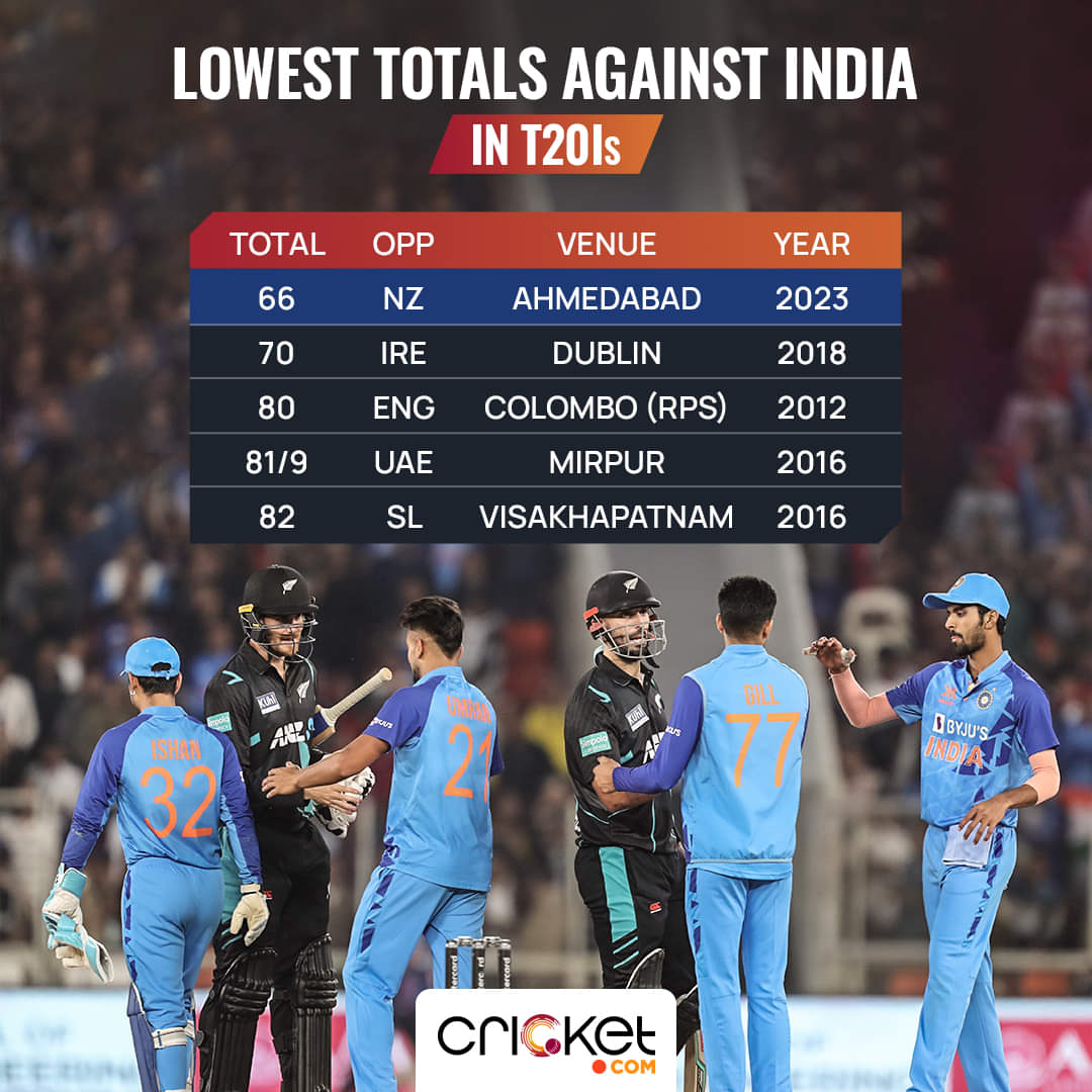Against India, this is the lowest-ever total by a team in the format. Previously, Ireland in 2018, were skittled out for 70. Interestingly, before the second T20I, New Zealand never scored a total below 100 against India. Now, in consecutive matches, they have suffered low totals.
