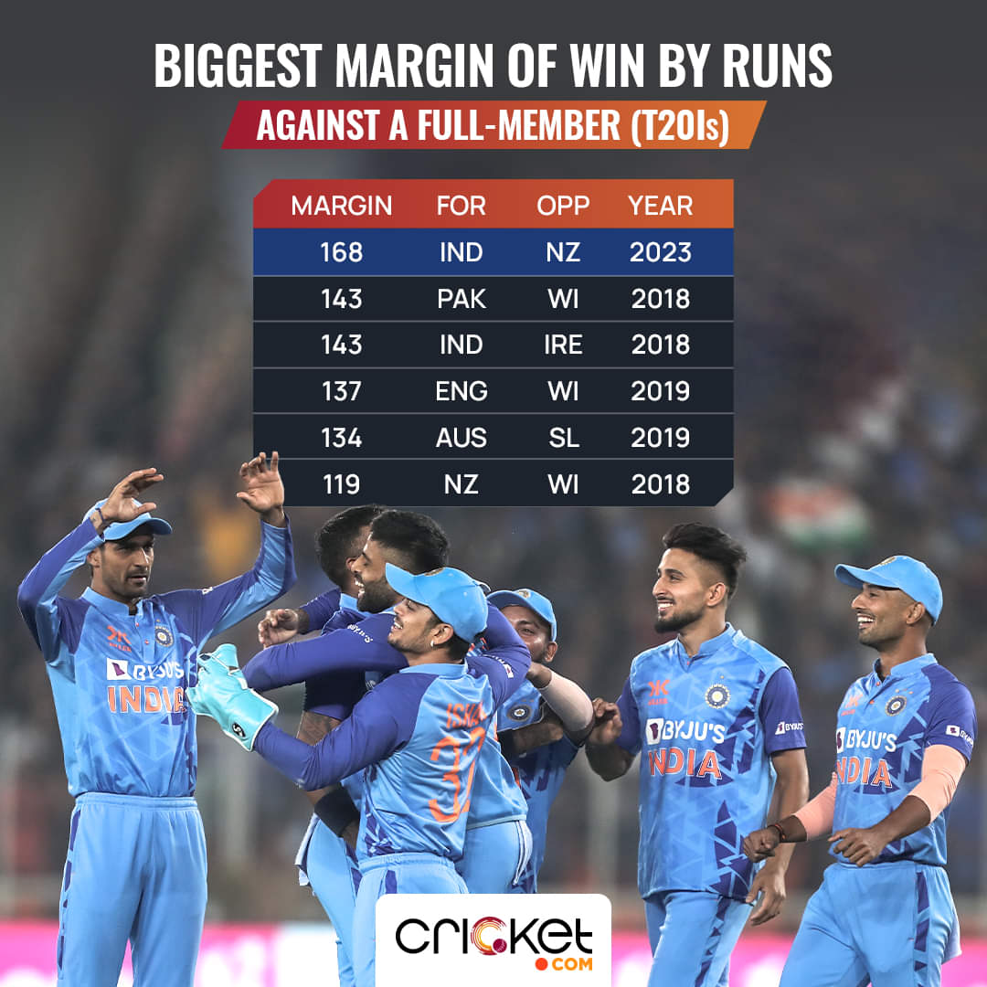As an effect of being all-out for 66, New Zealand suffered a 168-run margin defeat. In T20Is, this is the biggest margin of win against a full member nation.