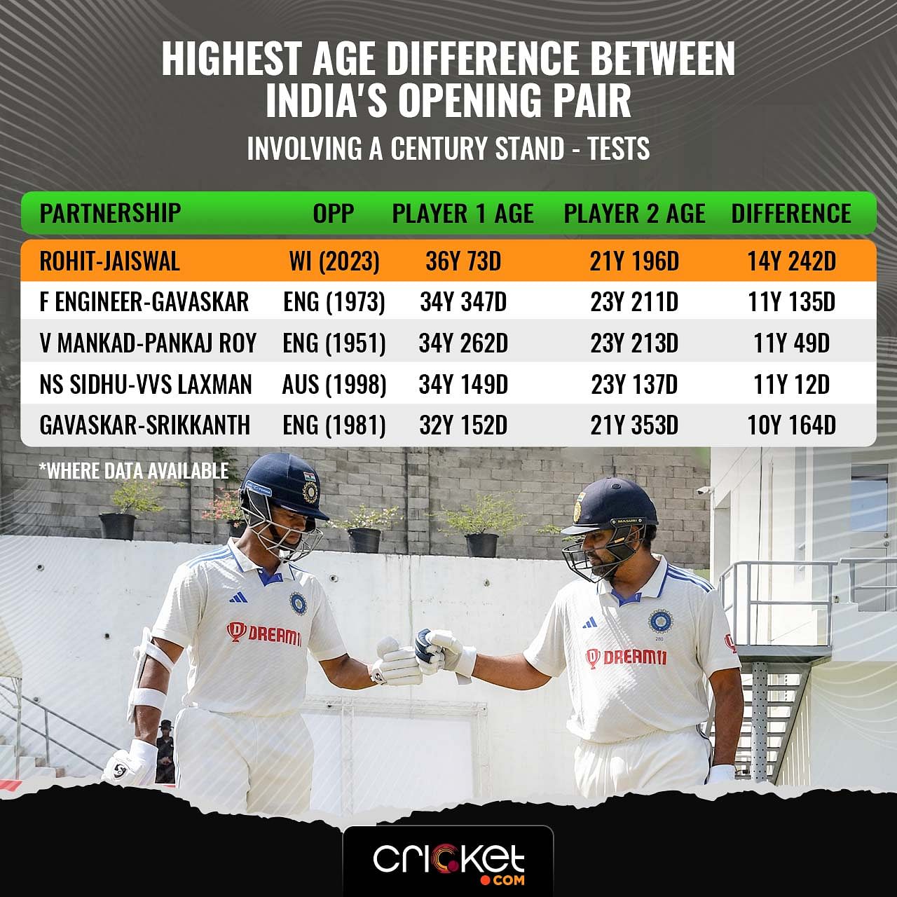 Between the two openers, Rohit and Jaiswal, there was an age gap of 14 years and 242 days. In a century-opening stand for India, this is the biggest age difference between two players (where age data is available).