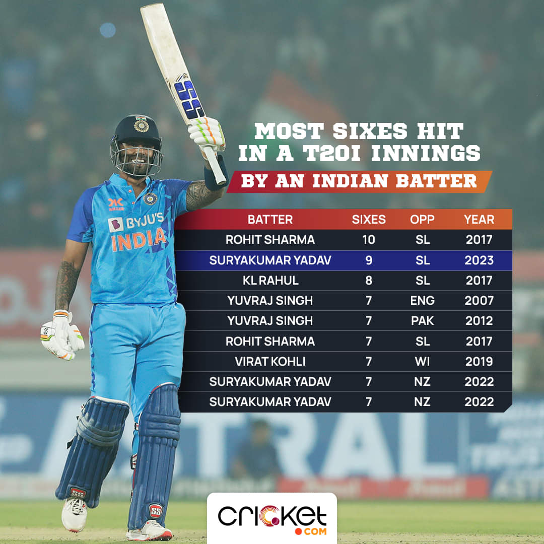 In his knock, SKY smashed nine sixes, which is the second most by an Indian batter in a T20I inning.