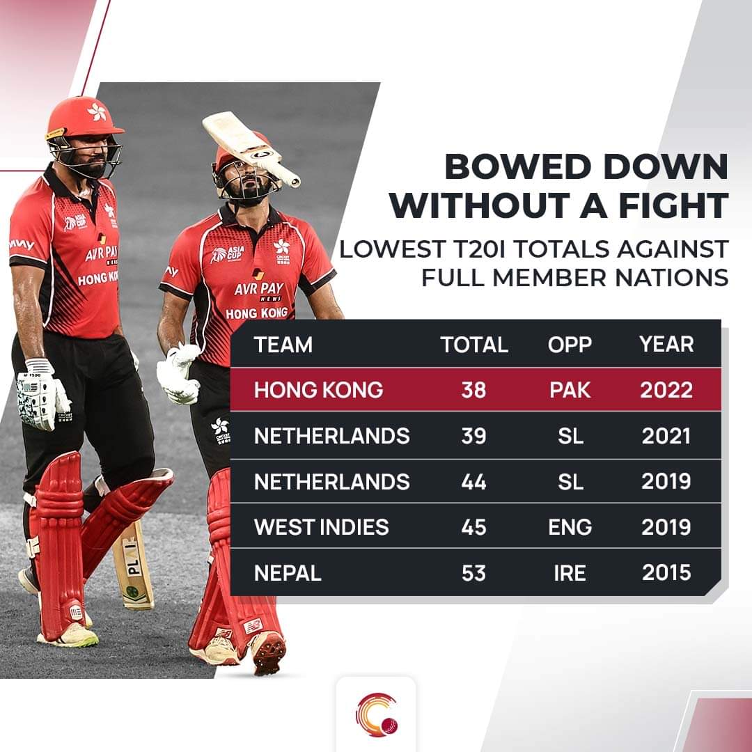 The total of 38 by Hong Kong, is the lowest ever total in Asia Cup across formats and the lowest total in U.A.E across formats.