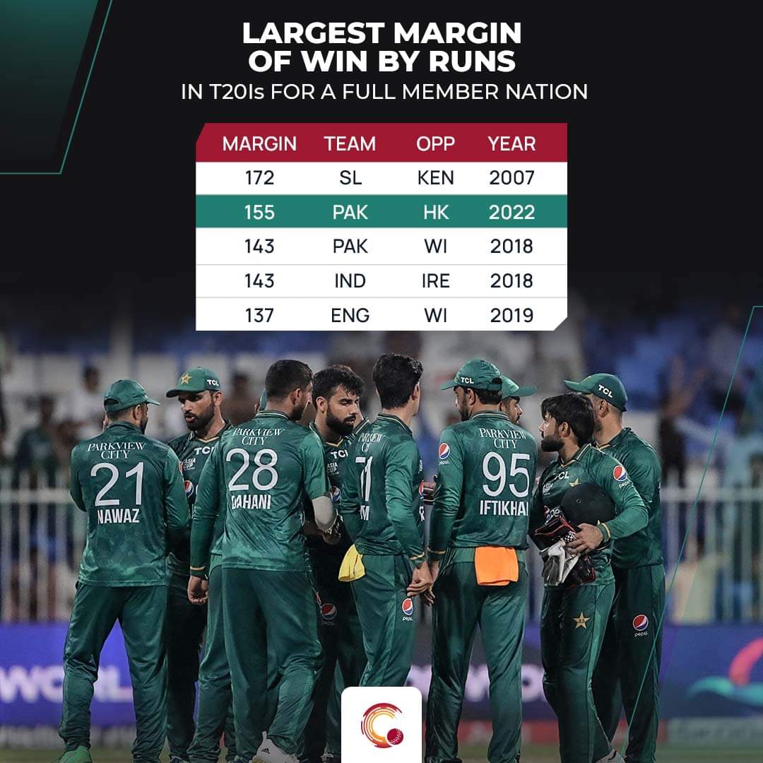 Pakistan registered a 155-run win, which is their largest win by runs in the format. Overall, among full member nations, only Sri Lanka against Kenya in 2007 had a bigger win.