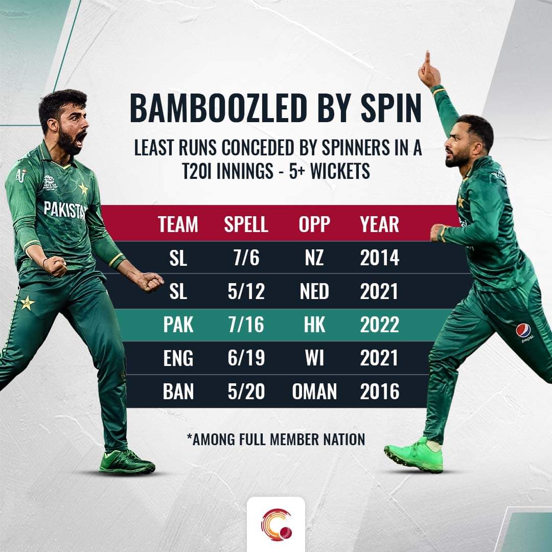 The spinners picked up seven wickets for just 16 runs, including the three-run over from Iftikar Ahmed. In T20Is among the full member nations, only Sri Lanka spinners, twice, had picked up five or more wickets for lesser runs in an innings.