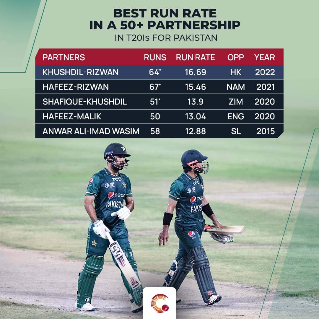 The pair forged an unbeaten partnership of 64 for the third wicket in just 23 balls, a run rate of 16.69. Their partnership run rate is the best for Pakistan in a 50+ runs stand in T20Is.