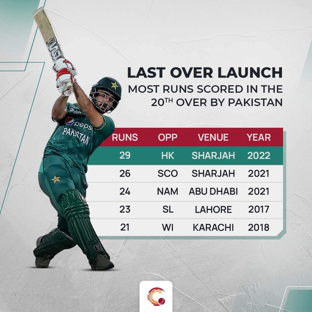 Khushdil, on strike, wasted the first two balls. But, he came back strongly by hitting four sixes of the remaining four legitimate deliveries. Hong Kong bowler Aizaz Khan, helped them with a wide four down the legside. Pakistan accumulated 29 runs in the last over, which is the most runs of the last over for them in T20Is.