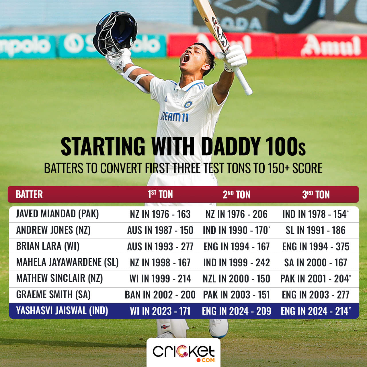 Jaiswal became the first Indian batter to convert each of his first three Test tons into a 150+ score. Previously, Vinod Kambli, VVS Laxman, and Cheteshwar Pujara had converted their first two to 150+.