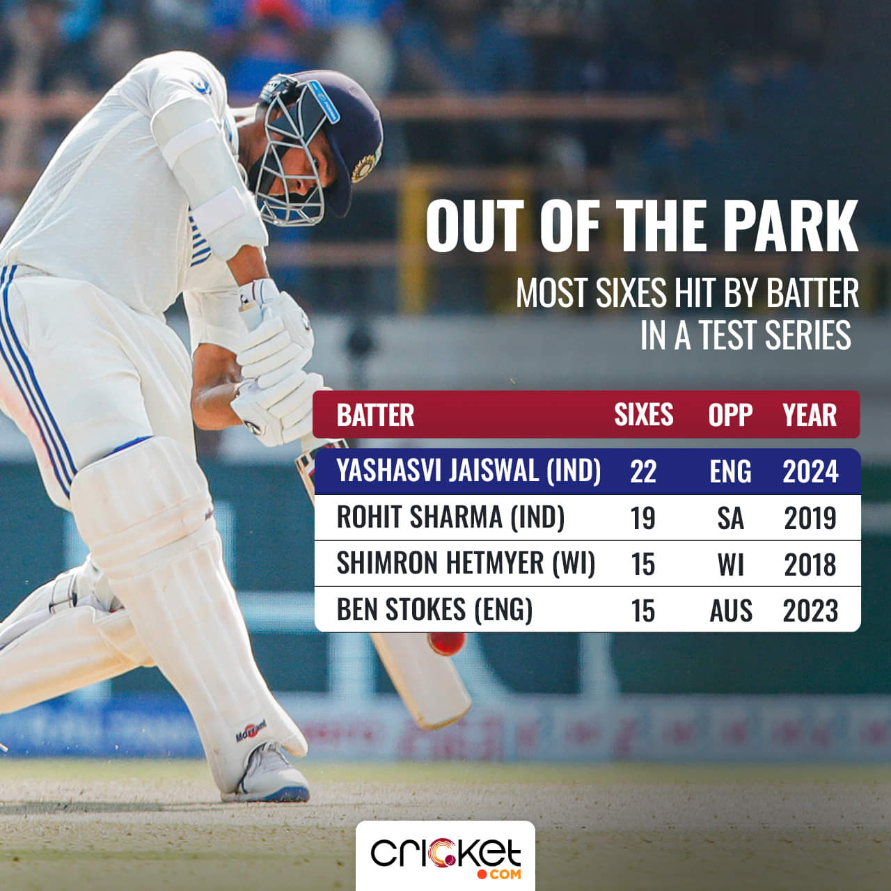 - Overall, Jaiswal has hit 22 sixes this series, which is the most by any batter in a bilateral Test series. The current Indian skipper, Rohit Sharma, hit 19 against South Africa in 2019.