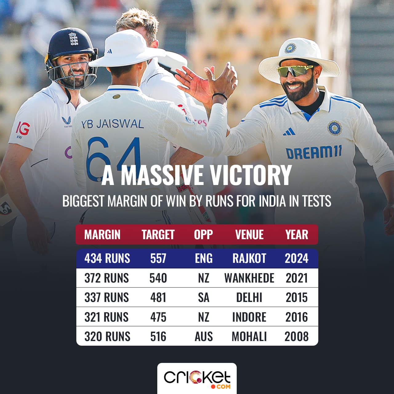 -With a win by 434 runs, India registered their biggest margin of win by runs. Also, this is England's second heaviest defeat in Tests. Against Australia in 1934, they had lost by 562 runs chasing 708.