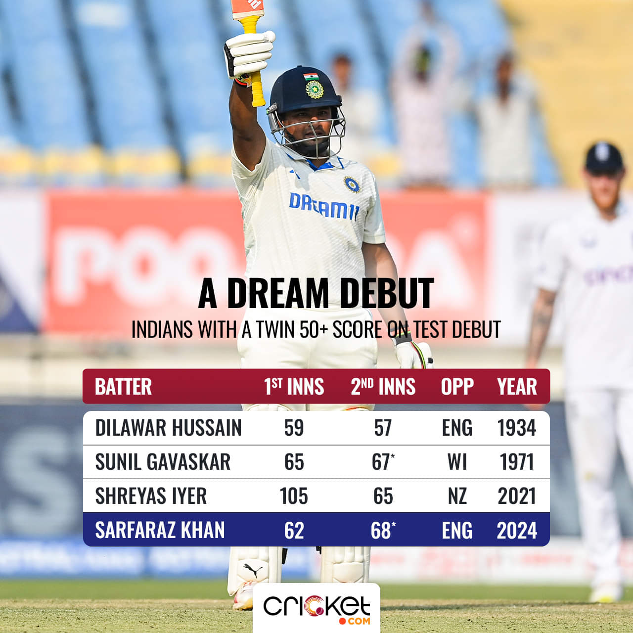 -Sarfaraz became the fourth Indian batter in Tests to register twin 50+ scores on debut. Shreyas Iyer (105 & 65) was the last batter to achieve this feat (vs NZ in 2021).